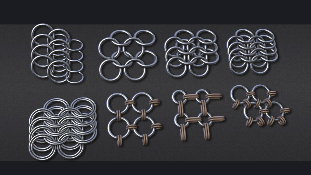chainmail patterns for zbrush or any modeling software where you can create instances of that patterns on base surface (blender, maya, 3dmax, houdini, c4d, etc...)